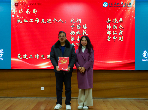 汇报结束后,会议进入2025年度表彰环节,对在科研、教学、社会服务等领域表现突出的教职工进行表彰,院领导为获奖人员颁奖。刘本才、郭艳红、钱坤、阮选敏、董浩、刘周颖、黄霁风、刘思雨、李娜、冯俊苗老师在2025年取得了丰硕的科研成果,获评“人文之星”;化柯、安晓燕、于茜瑶、韩模永、杨淑敏、郑仁霞、张永春、霍中财、王丽媛老师荣获“学院就业工作先进个人”称号;中国语言文学系党支部入选校级第三批水果派 党建工作样板支部培育单位名单(教工),党支部书记周阿根教授荣获“党建工作先进个人”荣誉称号。获奖代表依次上台领奖,现场掌声阵阵,既是对获奖者过往一年辛勤付出的肯定,也为全院教职工树立了学习的榜样。
